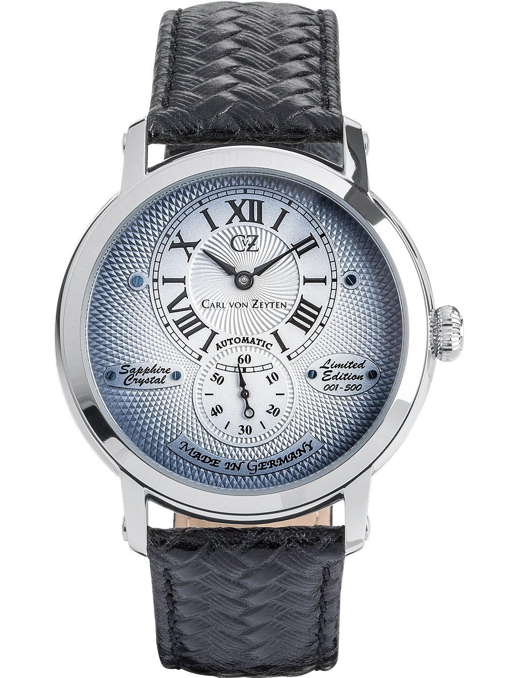 • Manufacturer no.: CVZ0066WH • Manufacturer series: Kandel automatic 43mm • Functions: Hour, Minute, Second • Movement: Automatic • Dial color: Blue, White • Display: Analog • Water resistant: 5 • Bezel: Fixed • Surface finish: Polished • Case color: Silver • Case material: Stainless steel • Case thickness: 11 • Limited edition: X / 500, Yes • Case shape: Round • Case width: 43 • Caseback: Glas bottom, screwed • Gender: Mens • Glas: anti-reflecting, Saphire glass • Style: Classic • Strap material: Calf leather • Strap color: Black • Lug width: 22 • Clasp: Folding clasp • Max wrist circumferences: 230 • Item weight: 0.10 • Scope of delivery: Box, Instruction, Packaging, Warranty documents