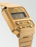 Brand: Casio • Manufacturer no.: A100WEG-9AEF • Manufacturer series: Vintage 33mm • Functions: Alarm, Date, Day, Hour, Minute, Second, Stop function, Timer • Movement: Battery (quartz) • Dial color: Grey • Display: Digital • Water resistant: 11798 • Bezel: Fixed • Surface finish: Polished • Case color: Gold • Case material: Resin • Case thickness: 9 • Case shape: Rectangle • Case width: 33 • Caseback: pressed, Stainless steel bottom • Gender: Ladies, Mens, Unisex • Glas: acrylic glass • Lighting: LED Light • Style: Sporty • Strap material: Stainless steel • Strap color: Gold • Lug width: 21 • Clasp: Clip clasp • Max wrist circumferences: 205 • Item weight: 0.05 • Scope of delivery: Box, Instruction, Packaging, Warranty documents"