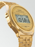 Brand: Casio • Manufacturer no.: A171WEG-9AEF • Manufacturer series: Vintage 37mm • Functions: 12-/24 time mode, Alarm, Automatic calender, Date, Day, Hour, Minute, Second, Stop function • Movement: Battery (quartz) • Dial color: Golden • Display: Digital • Water resistant: Nein • Bezel: Fixed • Surface finish: Polished • Case color: Gold • Case material: Resin • Case thickness: 9 • Case width: 37 • Caseback: screwed, Stainless steel bottom • Gender: Ladies, Mens, Unisex • Glas: acrylic glass • Lighting: LED Light • Style: Modern • Strap material: Stainless steel • Strap color: Gold • Lug width: 21 • Clasp: Clip clasp • Max wrist circumferences: 205 • Item weight: 0.05 • Scope of delivery: Box, Instruction, Packaging, Warranty documents"