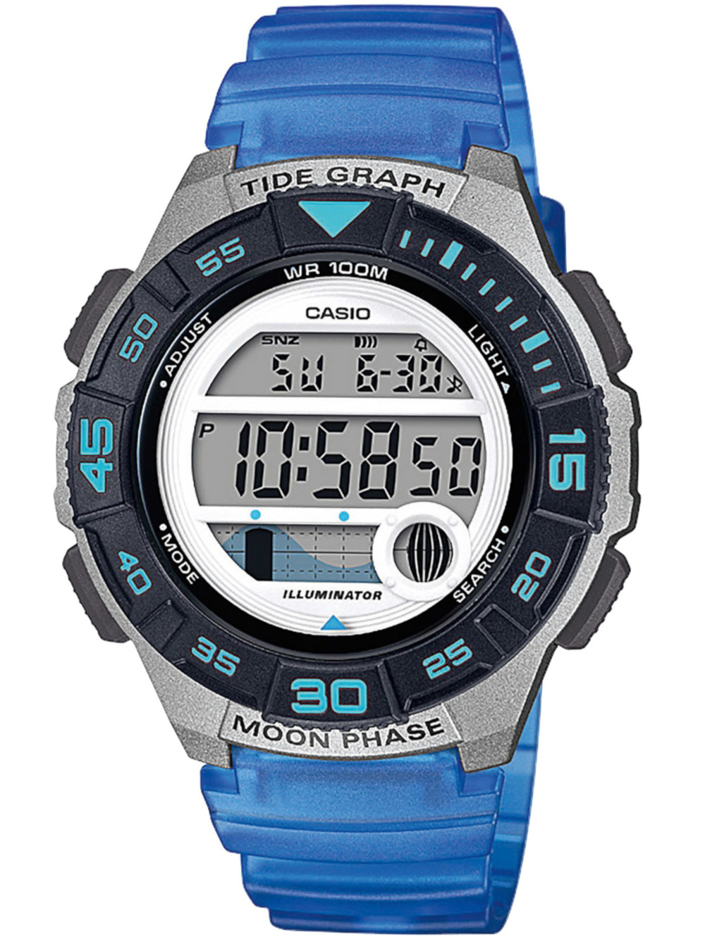 24-hour, Chronograph, Date, Gezeiten, Hour, Minute, Month, Moon phase, Schlummerfunktion, Second, Second time zone, Timer, Weekday