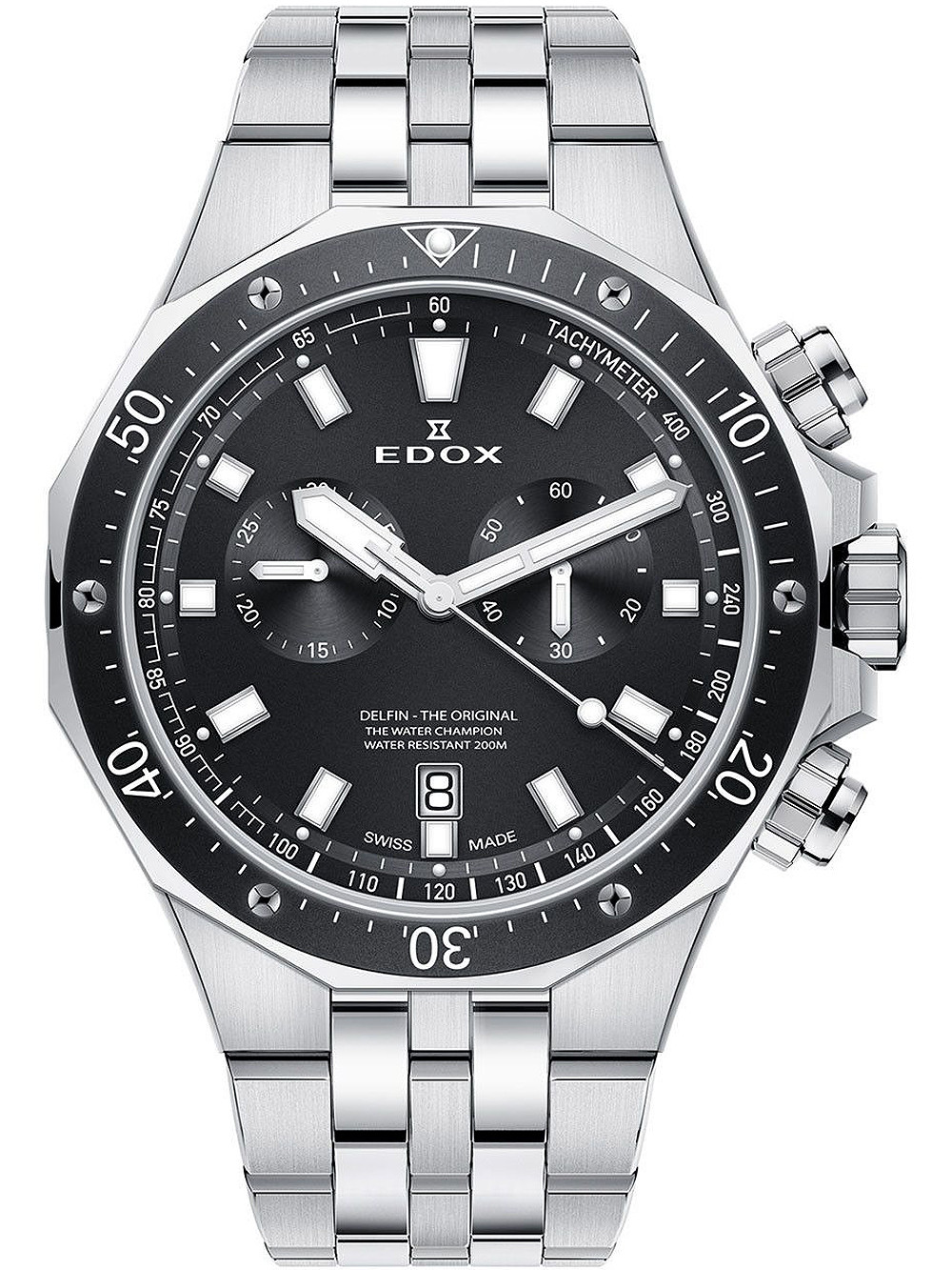 Brand: Edox • Manufacturer no.: 10109-3M-NIN • Manufacturer series: Delfin Chronograph 43mm • Functions: Chronograph, Date, Hour, Minute, Second • Movement: Battery (quartz) • Dial color: Black • Display: Analog • Water resistant: 20 • Bezel: counterclockwise, Turnable • Surface finish: Matted, Polished • Case color: Silver • Case material: Stainless steel • Case thickness: 12 • Case width: 43 • Caseback: screwed, Stainless steel bottom • Gender: Mens • Crown: Screwed • Glas: anti-reflecting, Saphire glass • Lighting: Illumin. hands, Illumin. indexes • Style: Sporty • Strap material: Stainless steel • Strap color: Silver • Lug width: 24 • Clasp: Butterfly clasp • Max wrist circumferences: 210 • Item weight: 0.18