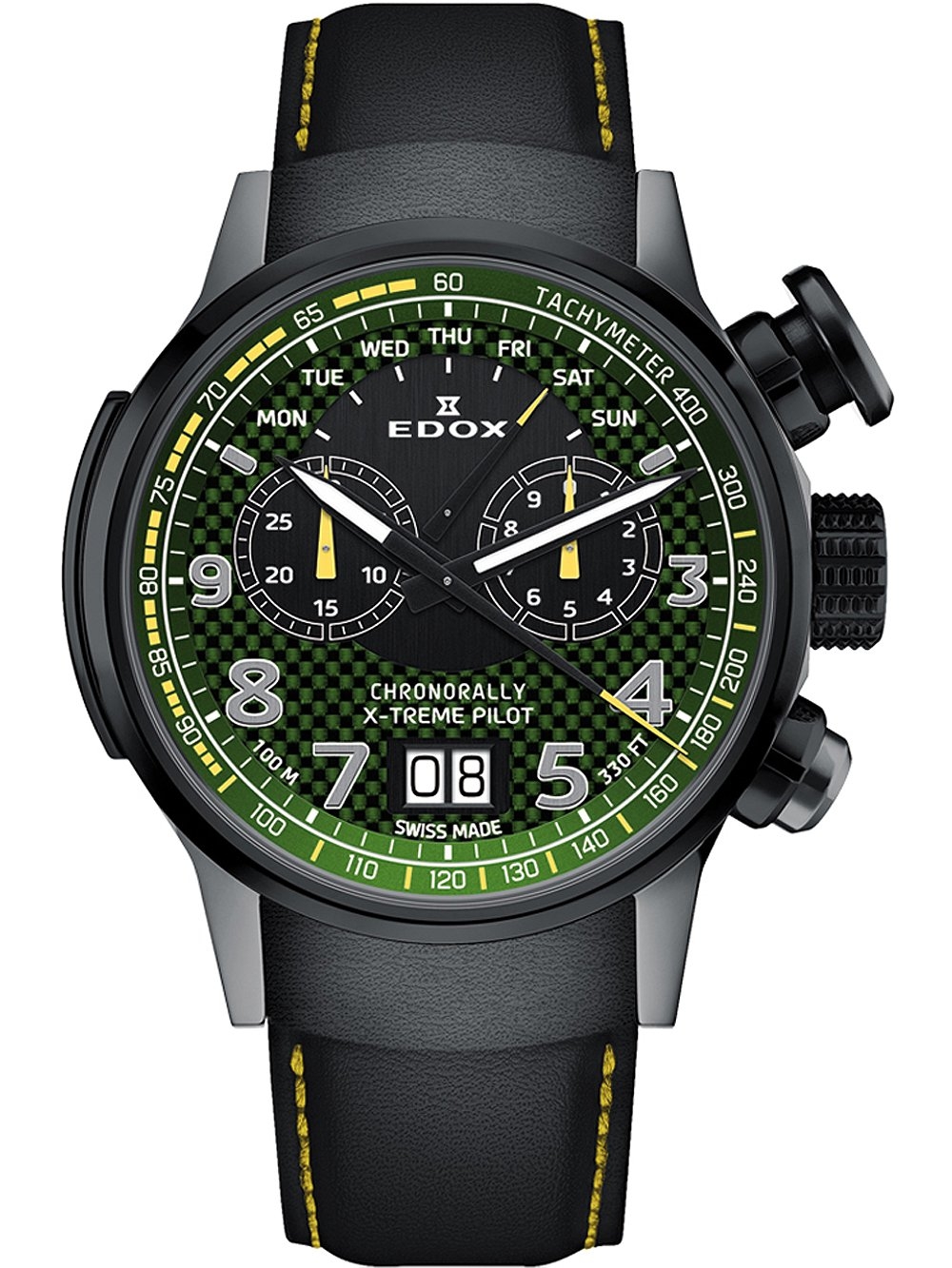 Brand: Edox • Manufacturer no.: 38001-TINGN-V3 • Manufacturer series: Chronorally X-treme Pilot 48mm • Functions: Chronograph, Date, Day, Hour, Minute • Movement: Battery (quartz) • Dial color: Black, Green • Display: Analog • Water resistant: 10 • Bezel: Fixed • Surface finish: Matted, Polished • Case color: Black • Case material: Titanium • Case thickness: 16 • Limited edition: Yes, X / 555 • Case width: 48 • Caseback: screwed, Titanium bottom • Gender: Mens • Glas: anti-reflecting, Saphire glass • Lighting: Illumin. hands, Illumin. indexes • Style: Sporty • Strap material: Calf leather • Strap color: Black • Lug width: 25 • Clasp: Buckle clasp • Max wrist circumferences: 220 • Item weight: 0.12