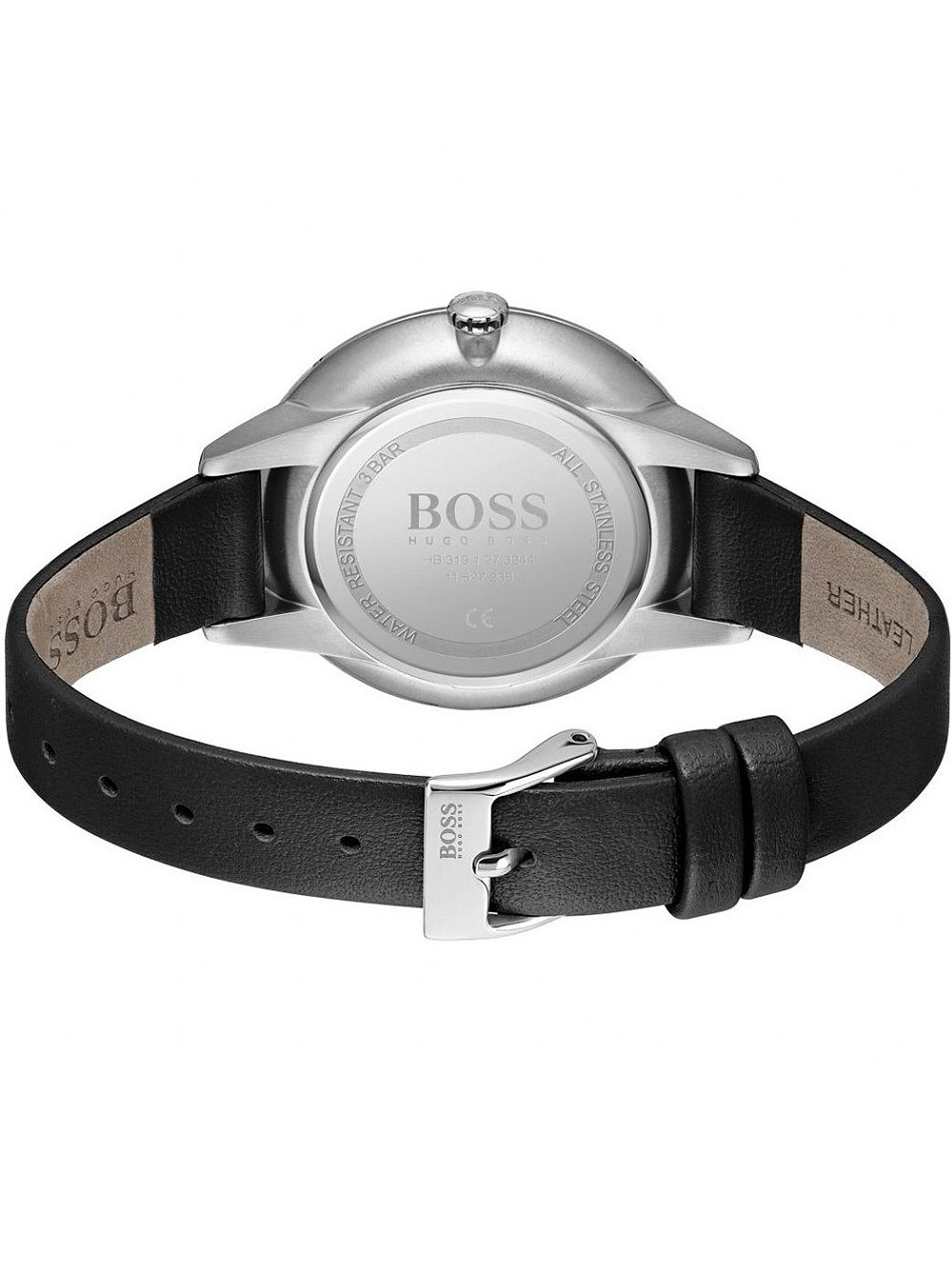 Brand: Hugo Boss • Manufacturer no.: 1502609 • Manufacturer series: Symphony 38mm • Functions: Hour, Minute, Second • Movement: Battery (quartz) • Dial color: Black • Display: Analog • Water resistant: 3 • Bezel: Fixed • Surface finish: Matted, Polished • Case color: Silver • Case material: Stainless steel • Case thickness: 8 • Case shape: Round • Case trimming: Zirconia • Case width: 38 • Caseback: pressed, Stainless steel bottom • Gender: Ladies • Glas: hardened, Mineral glass • Style: Modern • Strap material: Calf leather • Strap color: Black • Lug width: 14 • Clasp: Buckle clasp • Max wrist circumferences: 195 • Item weight: 0.03 • Scope of delivery: Box, Instruction, Packaging, Warranty documents"