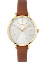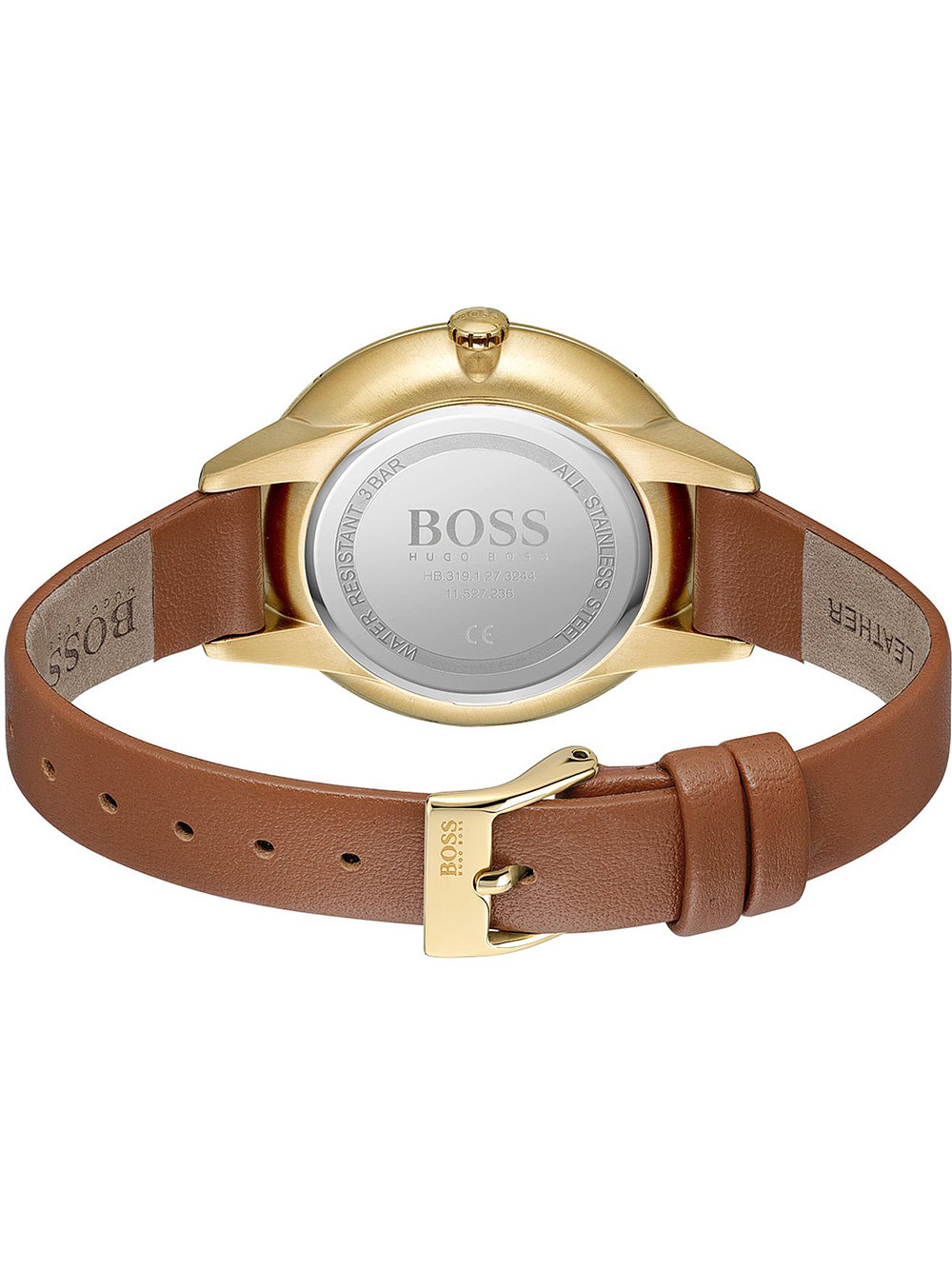 Brand: Hugo Boss • Manufacturer no.: 1502610 • Manufacturer series: Symphony 38mm • Functions: Hour, Minute, Second • Movement: Battery (quartz) • Dial color: Silver • Display: Analog • Water resistant: 3 • Bezel: Fixed • Surface finish: Matted, Polished • Case color: Gold • Case material: Stainless steel • Case thickness: 8 • Case shape: Oval • Case trimming: Zirconia • Case width: 38 • Caseback: pressed, Stainless steel bottom • Gender: Ladies • Glas: hardened, Mineral glass • Style: Modern • Strap material: Calf leather • Strap color: Brown • Lug width: 14 • Clasp: Buckle clasp • Max wrist circumferences: 195 • Item weight: 0.03 • Scope of delivery: Box, Instruction, Packaging, Warranty documents"