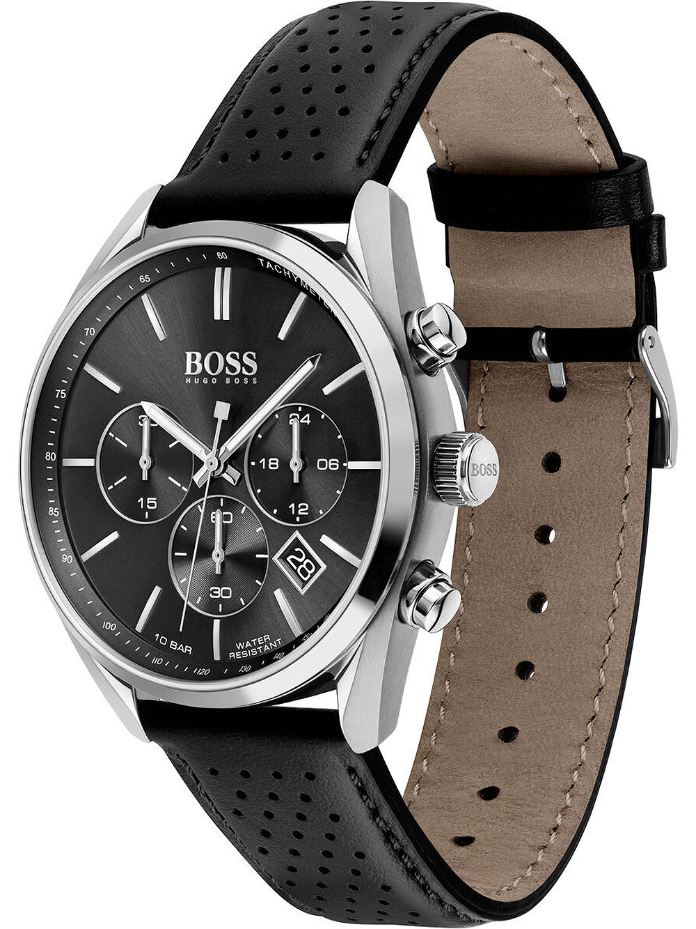Brand: Hugo Boss Brand: Hugo Boss • Manufacturer no.: 1513816 • Manufacturer series: Champion chrono 44mm • Functions: 24-hours, Chronograph, Date, Hour, Minute, Second • Movement: Battery (quartz) • Dial color: Black • Display: Analog • Water resistant: 10 • Bezel: Fixed • Surface finish: Matted, Polished • Case color: Silver • Case material: Stainless steel • Case thickness: 12 • Case width: 44 • Caseback: screwed, Stainless steel bottom • Gender: Mens • Glas: hardened, Mineral glass • Lighting: Illumin. hands • Style: Sporty • Strap material: Calf leather • Strap color: Black • Lug width: 22 • Clasp: Buckle clasp • Max wrist circumferences: 220 • Item weight: 0.07"