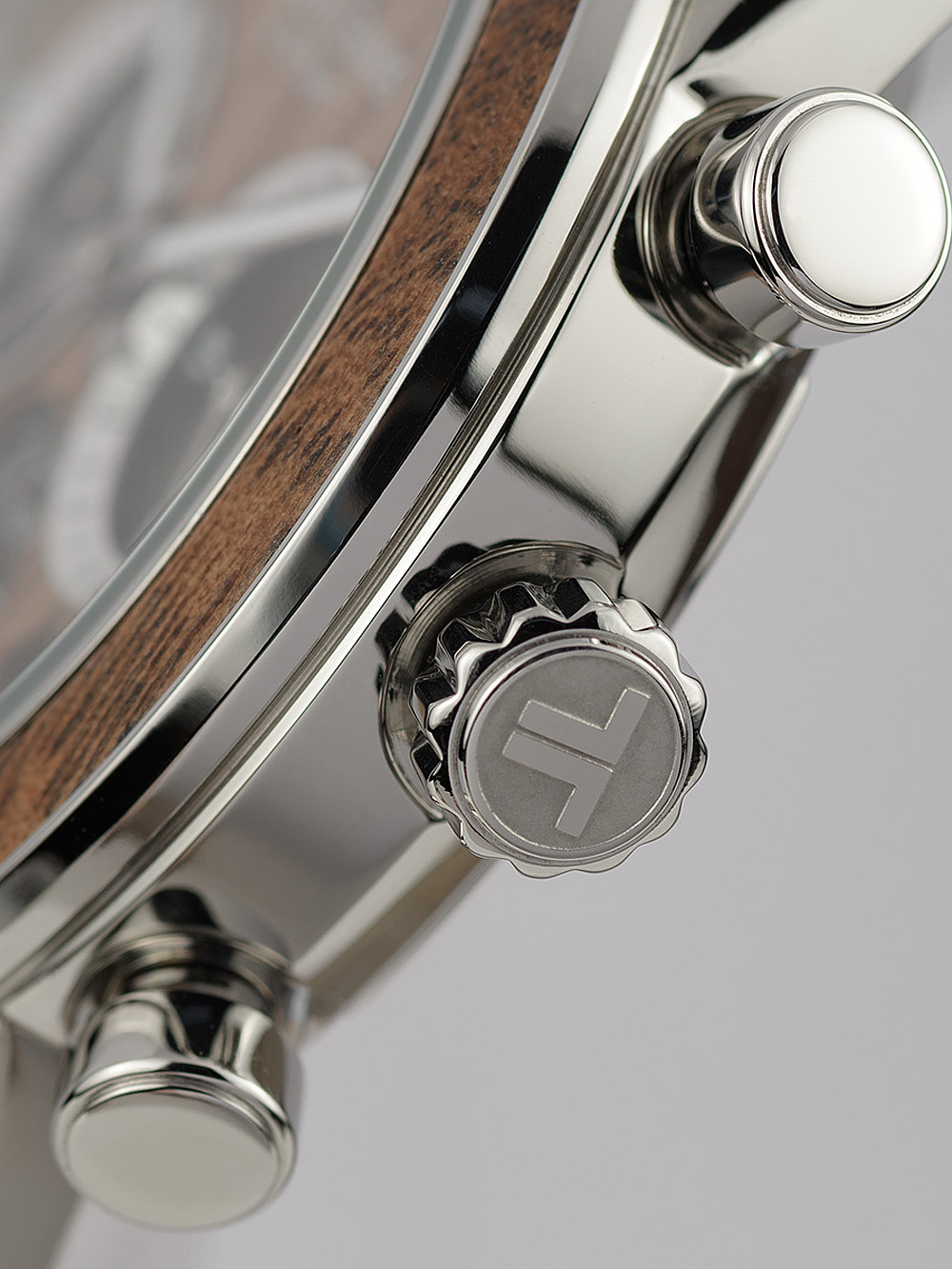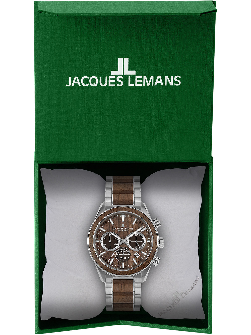 • Manufacturer no.: 1-2115J • Manufacturer series: Eco Power 44mm • Functions: 24-hours, Chronograph, Date, Hour, Minute, Second • Movement: Solar (quartz) • Dial color: Brown • Display: Analog • Water resistant: 10 • Bezel: Fixed • Surface finish: Matted, Polished • Case color: Silver • Case material: Stainless steel • Case thickness: 12 • Case shape: Round • Case width: 44 • Caseback: screwed, Stainless steel bottom • Gender: Mens • Glas: hardened, Mineral glass • Lighting: Illumin. hands, Illumin. indexes • Style: Sporty • Strap material: Stainless steel, Wood • Strap color: Brown, Silver • Lug width: 22 • Clasp: Folding clasp • Max wrist circumferences: 190 • Item weight: 0.14