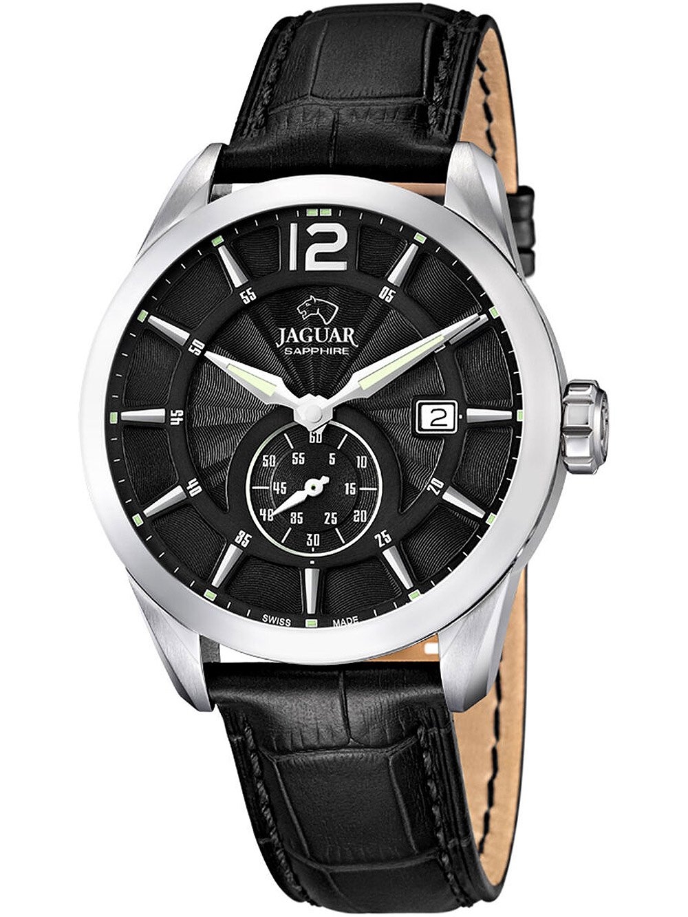 • Manufacturer no.: J663/4 • Manufacturer series: Acamar 43mm • Functions: Date, Hour, Minute, Second • Movement: Battery (quartz) • Dial color: Black • Display: Analog • Water resistant: 10 • Bezel: Fixed • Surface finish: Matted, Polished • Case color: Silver • Case material: Stainless steel • Case thickness: 10 • Case width: 43 • Caseback: screwed, Stainless steel bottom • Gender: Mens • Glas: anti-reflecting, Saphire glass • Lighting: Illumin. hands, Illumin. indexes • Style: Modern • Strap material: Calf leather • Strap color: Black • Lug width: 21 • Clasp: Folding clasp • Max wrist circumferences: 230 • Item weight: 0.09 • Scope of delivery: Box, Instruction, Packaging, Warranty documents