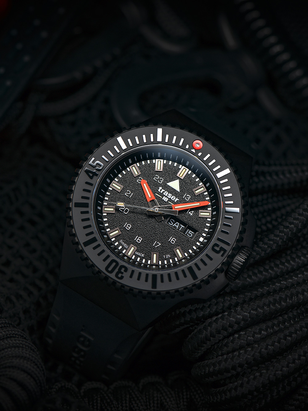 Brand: Traser H3 • Manufacturer no.: 109855 • Manufacturer series: P69 Black Black 46mm • Functions: Date, Day, Hour, Minute, Second • Movement: Battery (quartz) • Movement label: Ronda, Swiss Made • Dial color: Black • Display: Analog • Water resistant: 20 • Bezel: bidirectional, Turnable • Surface finish: Matted • Case color: Black • Case material: Stainless steel • Case thickness: 16 • Case width: 46 • Caseback: screwed, Stainless steel bottom • Gender: Mens • Crown: Screwed • Glas: anti-reflecting, Saphire glass • Lighting: Illumin. hands, Illumin. indexes, Illuminator, trigalight® , Tritium-Illuminant • Style: Sporty • Strap material: Caoutchouc • Strap color: Black • Lug width: 22 • Clasp: Buckle clasp • Max wrist circumferences: 220 • Item weight: 0.15