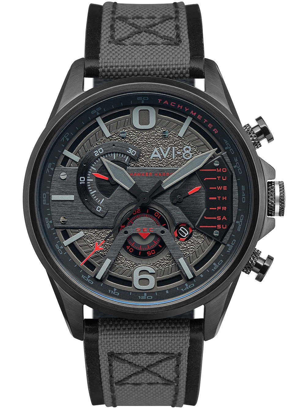 • Manufacturer no.: AV-4056-05 • Manufacturer series: Hawker Harrier Chronograph 45mm • Functions: Chronograph, Date, Day, Hour, Minute, Second • Movement: Battery (quartz) • Dial color: Grey • Display: Analog • Water resistant: 5 • Bezel: Fixed • Surface finish: Matted, Polished • Case color: Black • Case material: Stainless steel • Case thickness: 15 • Case shape: Round • Case width: 45 • Caseback: screwed, Stainless steel bottom • Gender: Mens • Glas: hardened, Mineral glass • Lighting: Illumin. hands, Illumin. indexes • Style: Sporty • Strap material: Calf leather • Strap color: Black, Grey • Lug width: 22 • Clasp: Buckle clasp • Max wrist circumferences: 230 • Item weight: 0.10 • Scope of delivery: Box, Instruction, Packaging, Warranty documents