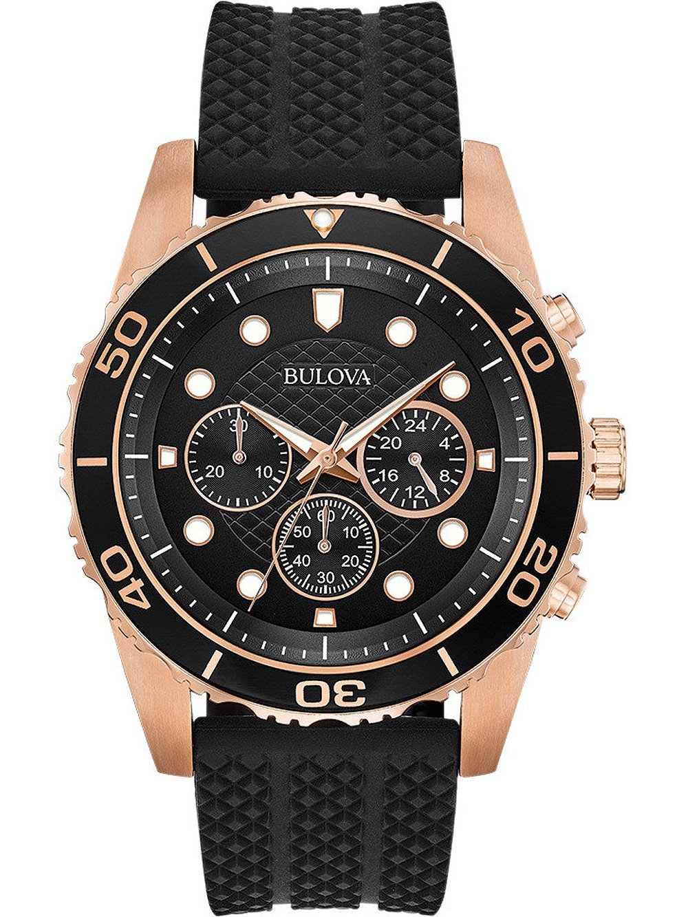 • Manufacturer no.: 98A192 • Manufacturer series: Sport Chronograph 43mm • Functions: 24-hours, Chronograph, Hour, Minute, Second • Movement: Battery (quartz) • Dial color: Black • Display: Analog • Water resistant: 10 • Bezel: counterclockwise, Turnable • Surface finish: Matted, Polished • Case color: Rosé gold • Case material: Stainless steel • Case thickness: 12 • Case shape: Round • Case width: 43 • Caseback: screwed, Stainless steel bottom • Gender: Mens • Glas: hardened, Mineral glass • Lighting: Illumin. hands, Illumin. indexes • Style: Sporty • Strap material: Silicon • Strap color: Black • Lug width: 22 • Clasp: Buckle clasp • Max wrist circumferences: 230 • Item weight: 0.10 • Scope of delivery: Box, Instruction, Packaging, Warranty documents