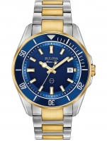Brand: Bulova • Manufacturer no.: 98B334 • Manufacturer series: Marine Star 43mm • Functions: Date, Hour, Minute, Second • Movement: Battery (quartz) • Dial color: Blue • Display: Analog • Water resistant: 10 • Bezel: counterclockwise, Turnable • Surface finish: Matted, Polished • Case color: Gold, Silver • Case material: Stainless steel • Case thickness: 12 • Case width: 43 • Caseback: screwed, Stainless steel bottom • Gender: Mens • Glas: hardened, Mineral glass • Lighting: Illumin. hands, Illumin. indexes • Style: Sporty • Strap material: Stainless steel • Strap color: Gold, Silver • Lug width: 22 • Clasp: Folding clasp • Max wrist circumferences: 220 • Item weight: 0.17