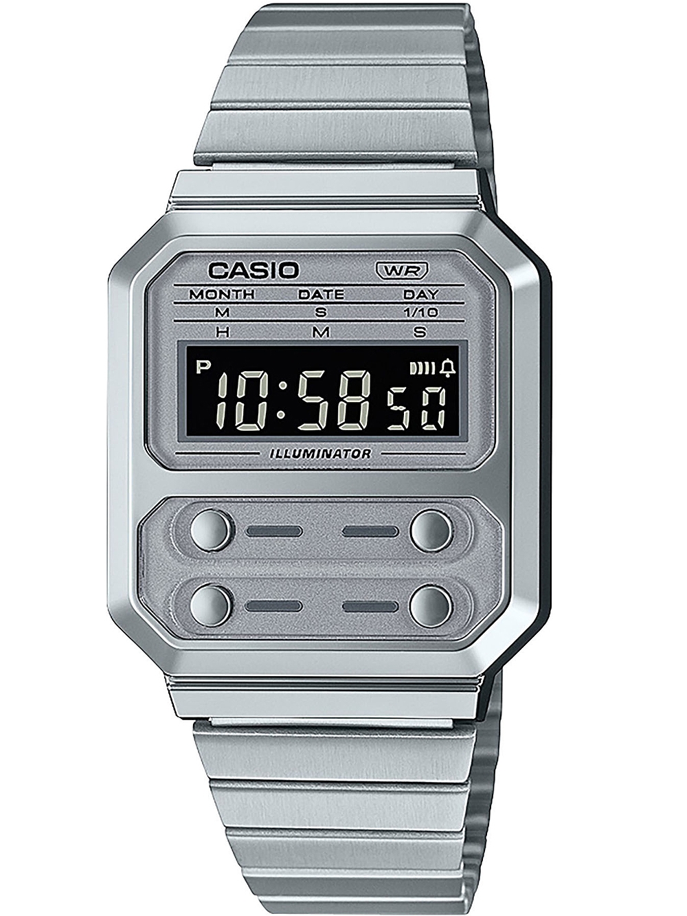 Brand: Casio • Manufacturer no.: A100WE-7BEF • Manufacturer series: Vintage 33mm • Functions: 12-/24 time mode, Alarm, Automatic calender, Date, Day, Hour, Minute, Second, Stop function • Movement: Battery (quartz) • Dial color: Grey • Display: Digital • Water resistant: 11798 • Bezel: Fixed • Surface finish: Matted, Polished • Case color: Silver • Case material: Resin • Case thickness: 9 • Case width: 33 • Caseback: pressed, Stainless steel bottom • Gender: Ladies, Mens, Unisex • Glas: acrylic glass • Lighting: LED Light • Style: Sporty • Strap material: Stainless steel • Strap color: Silver • Lug width: 21 • Clasp: Clip clasp • Max wrist circumferences: 200 • Item weight: 0.05 • Scope of delivery: Box, Instruction, Packaging, Warranty documents"