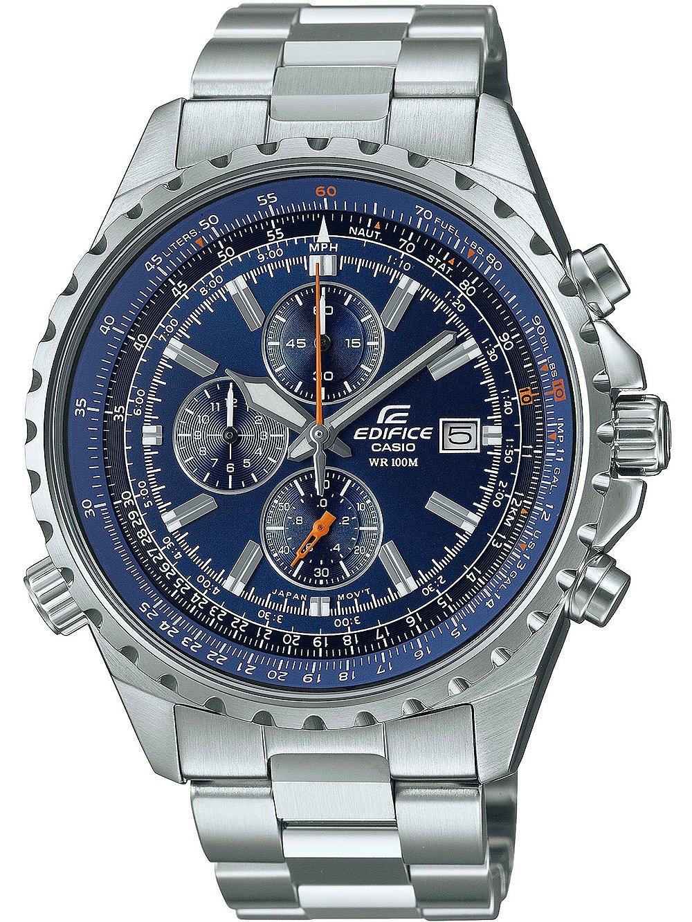 Brand: Casio • Manufacturer no.: EF-527D-2AVUEF • Manufacturer series: Edifice 44mm • Functions: Chronograph, Date, Hour, Minute, Second • Movement: Battery (quartz) • Dial color: Blue • Display: Analog • Water resistant: 10 • Bezel: Fixed • Surface finish: Matted, Polished • Case color: Silver • Case material: Stainless steel • Case thickness: 12 • Case shape: Round • Case width: 44 • Caseback: screwed, Stainless steel bottom • Gender: Mens • Crown: Screwed • Glas: hardened, Mineral glass • Lighting: Illumin. hands, Illumin. indexes • Style: Sporty • Strap material: Stainless steel • Strap color: Silver • Lug width: 22 • Clasp: Folding clasp • Max wrist circumferences: 220 • Item weight: 0.16 • Scope of delivery: Box, Instruction, Packaging, Warranty documents"