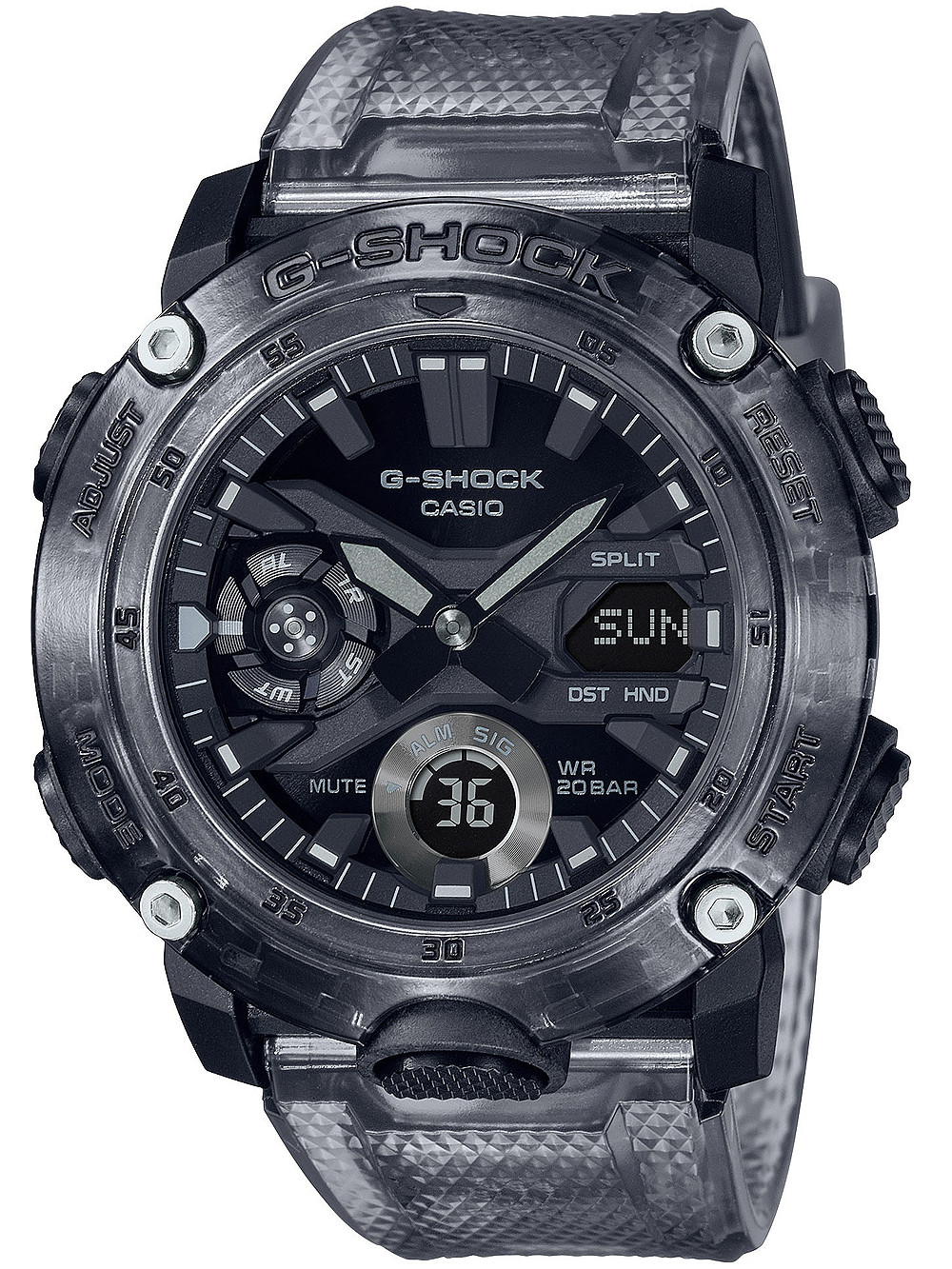 Brand: Casio • Manufacturer no.: GA-2000SKE-8AER • Manufacturer series: G-Shock 48mm • Functions: 12-/24 time mode, Alarm, Automatic calender, Date, Day, Hour, Minute, Second, Shock resistant, Stop function, Timer, Worldtimer • Movement: Battery (quartz) • Dial color: Black • Display: Analog, Digital • Water resistant: 20 • Bezel: Fixed • Surface finish: Matted • Case color: Black, Transparent • Case material: Carbon, Stainless steel • Case thickness: 14 • Case width: 48 • Caseback: screwed, Karbonboden • Gender: Mens • Glas: hardened, Mineral glass • Lighting: LED Light • Style: Sporty • Strap material: Resin • Strap color: Black, Transparent • Lug width: 26 • Clasp: Buckle clasp • Max wrist circumferences: 220 • Item weight: 0.06 • Scope of delivery: Box, Instruction, Packaging, Warranty documents"