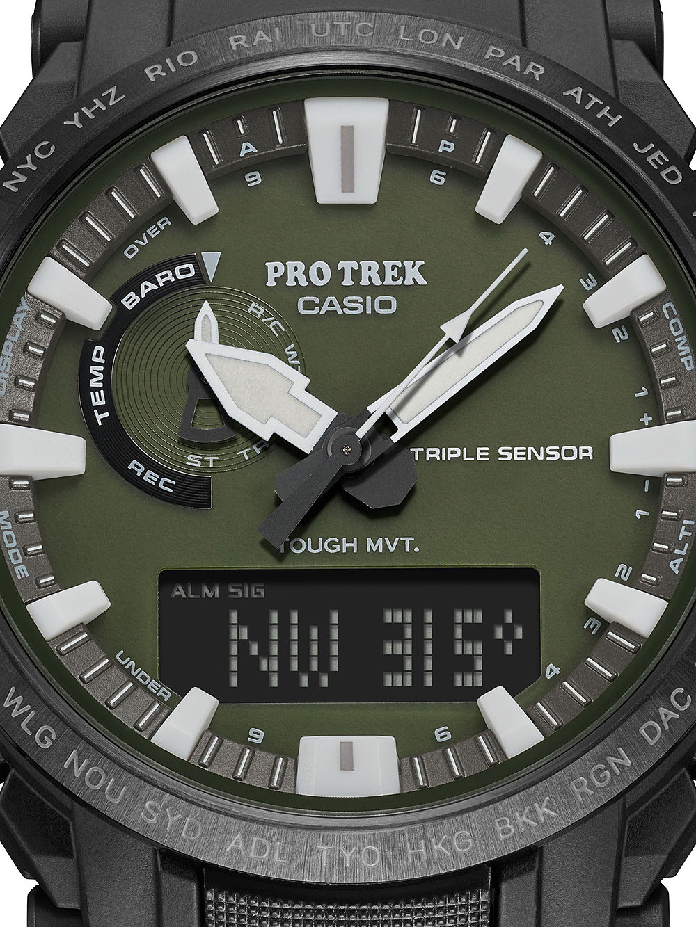Brand: Casio • Manufacturer no.: PRW-61Y-3ER • Manufacturer series: Pro Trek Radio Controlled Solar 47mm • Functions: 5 day alarm, Altimeter, autom. time adjusting, Automatic calender, Barometer, Date, Day, Hour, Minute, Month, Radiocontrolled, Second, Solar, Stop function, Thermometer, Timer, Worldtimer • Movement: Solar (quartz) • Dial color: Green • Display: Analog, Digital • Water resistant: 10 • Bezel: Fixed • Surface finish: Matted • Case color: Black • Case material: Resin • Case thickness: 15 • Case shape: Round • Case width: 47 • Caseback: screwed, Resin • Gender: Mens • Glas: hardened, Mineral glass • Lighting: Full-Auto-LED Light • Style: Sporty • Strap material: Resin • Strap color: Green • Lug width: 23 • Clasp: Buckle clasp • Max wrist circumferences: 240 • Item weight: 0.05 • Scope of delivery: Box, Instruction, Packaging, Warranty documents"