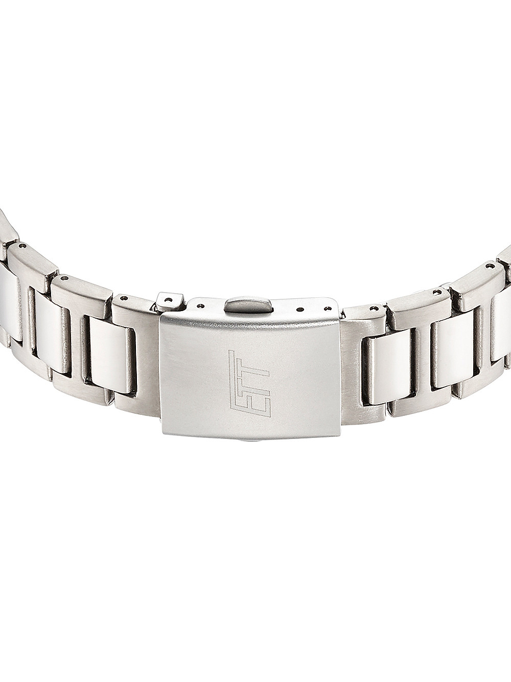 Brand: ETT Eco Tech Time • Manufacturer no.: ELT-11466-24M • Manufacturer series: Everest • Functions: Date, Hour, Minute, Perpetual calendar, Radiocontrolled, Second, Solar, Summertime DST, Overcharge protection • Movement: Solar (quartz) • Movement label: Empfang des Signals DCF 77 (Mainflingen, DE), W328 • Dial color: Black • Display: Analog • Water resistant: 5 • Bezel: Fixed • Surface finish: Matted • Case color: Grey • Case material: Titanium • Case thickness: 11 • Case trimming: Zirconia • Case width: 34 • Caseback: screwed, Titanium bottom • Gender: Ladies • Glas: hardened, Mineral glass • Lighting: Illumin. hands • Style: Classic • Strap material: Titanium • Strap color: Grey • Lug width: 19 • Clasp: Folding clasp • Max wrist circumferences: 185 • Item weight: 0.07