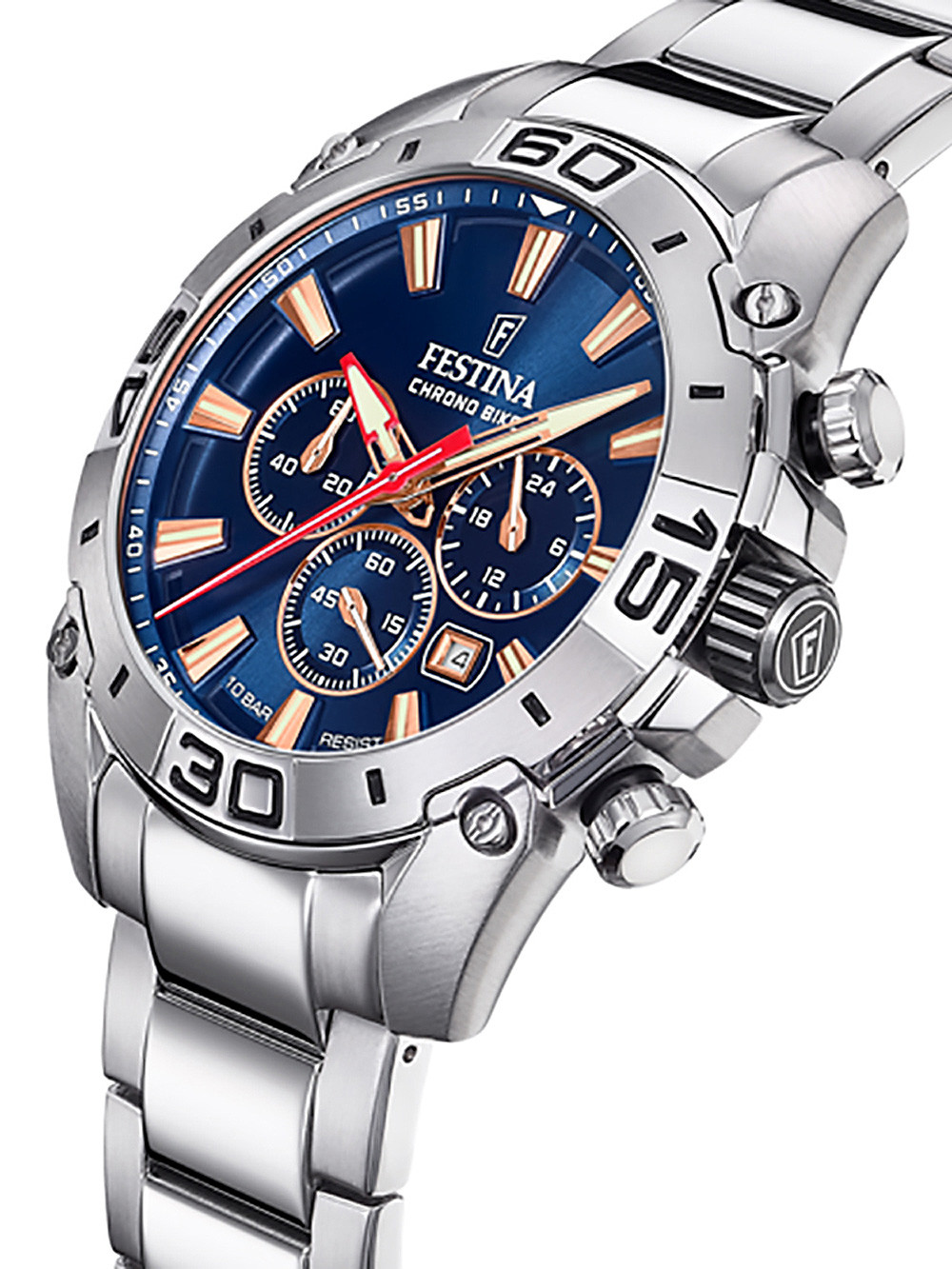 Brand: Festina • Manufacturer no.: F20543/4 • Manufacturer series: chrono Bike 45mm • Functions: 24-hours, Chronograph, Date, Hour, Minute, Second • Movement: Battery (quartz) • Dial color: Blue • Display: Analog • Water resistant: 10 • Bezel: Fixed • Surface finish: Matted, Polished • Case color: Silver • Case material: Stainless steel • Case thickness: 14 • Case shape: Round • Case width: 45 • Caseback: screwed, Stainless steel bottom • Gender: Mens • Glas: hardened, Mineral glass • Lighting: Illumin. hands, Illumin. indexes • Style: Sporty • Strap material: Stainless steel • Strap color: Silver • Lug width: 22 • Clasp: Folding clasp • Max wrist circumferences: 205 • Item weight: 0.19 • Scope of delivery: Box, Instruction, Packaging, Warranty documents"