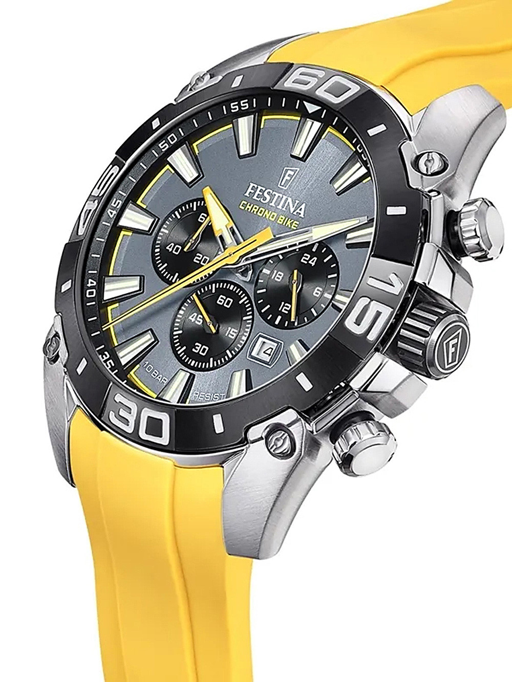 Brand: Festina • Manufacturer no.: F20544/7 • Manufacturer series: chrono Bike 45mm • Functions: 24-hours, Chronograph, Date, Hour, Minute, Second • Movement: Battery (quartz) • Dial color: Grey • Display: Analog • Water resistant: 10 • Bezel: Fixed • Surface finish: Matted, Polished • Case color: Silver • Case material: Stainless steel • Case thickness: 14 • Case shape: Round • Case width: 45 • Caseback: screwed, Stainless steel bottom • Gender: Mens • Glas: hardened, Mineral glass • Lighting: Illumin. hands, Illumin. indexes • Style: Sporty • Strap material: Silicon • Strap color: Yellow • Lug width: 26 • Clasp: Buckle clasp • Max wrist circumferences: 220 • Item weight: 0.12 • Scope of delivery: Box, Instruction, Packaging, Warranty documents"