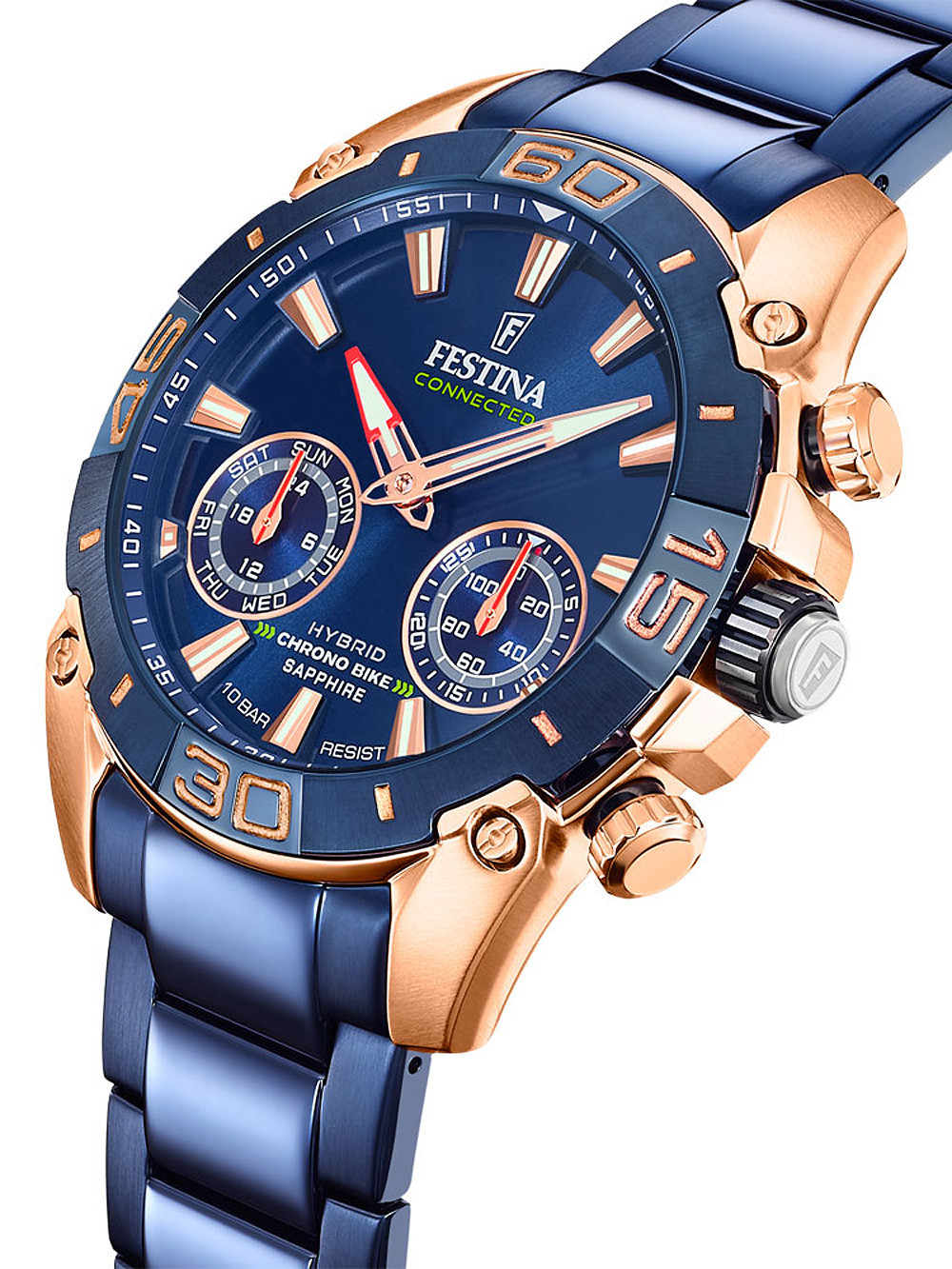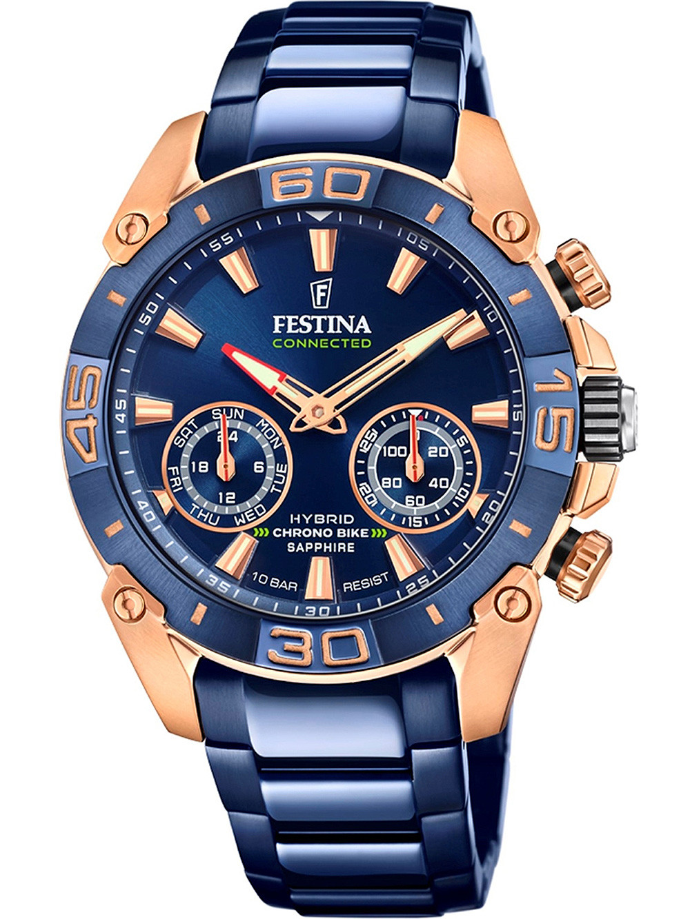 Brand: Festina • Manufacturer no.: F20549/1 • Manufacturer series: chrono Bike Hybrid special edition 45mm • Functions: 24-hours, Alarm, Chronograph, Day, Hour, Minute, Music control, Pedometer, Phone Finder, Timer • Movement: Battery (quartz) • Dial color: Blue • Display: Analog • Water resistant: 10 • Bezel: Fixed • Surface finish: Matted, Polished • Case color: Rosé gold • Case material: Stainless steel • Case thickness: 15 • Case shape: Round • Case width: 45 • Caseback: screwed, Stainless steel bottom • Gender: Mens • Glas: anti-reflecting, Saphire glass • Lighting: Illumin. hands, Illumin. indexes • Style: Sporty • Strap material: Stainless steel • Strap color: Blue • Lug width: 22 • Clasp: Folding clasp • Max wrist circumferences: 205 • Item weight: 0.20 • Scope of delivery: Box, Instruction, Packaging, Warranty documents"