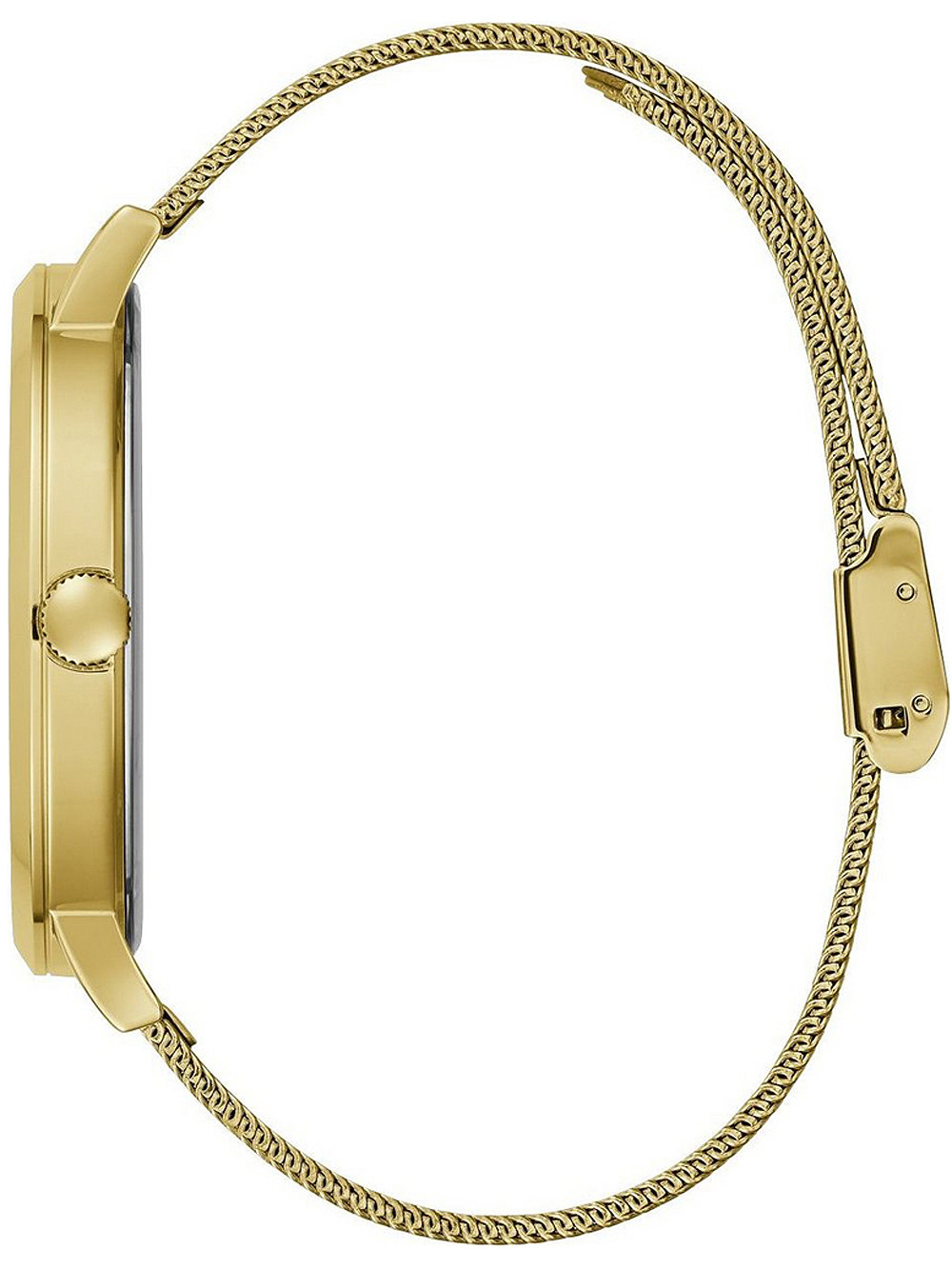 Brand: Guess • Manufacturer no.: GW0049G1 • Manufacturer series: Imprint 44mm • Functions: Hour, Minute, Second • Movement: Battery (quartz) • Dial color: Golden • Display: Analog • Water resistant: 3 • Bezel: Fixed • Surface finish: Polished • Case color: Gold • Case material: Stainless steel • Case thickness: 10 • Case width: 44 • Caseback: pressed, Stainless steel bottom • Gender: Ladies, Mens, Unisex • Glas: hardened, Mineral glass • Style: Modern • Strap material: Stainless steel • Strap color: Gold • Lug width: 22 • Clasp: Clip clasp • Max wrist circumferences: 210 • Item weight: 0.08