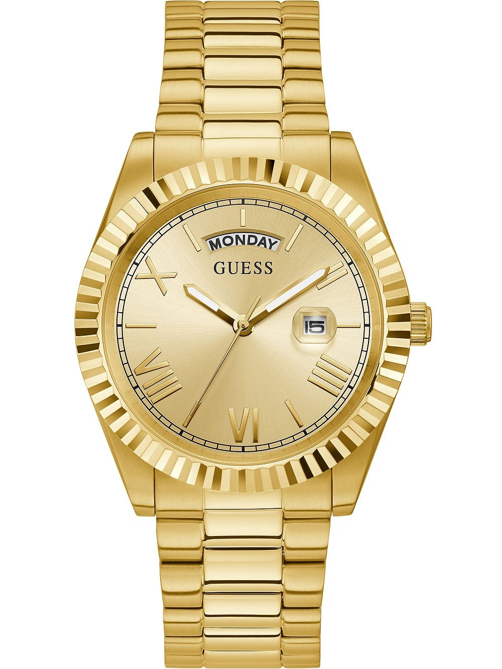 • Manufacturer no.: GW0265G2 • Manufacturer series: Connoisseur Herren 42mm • Functions: Date, Day, Hour, Minute, Second • Movement: Battery (quartz) • Dial color: Golden • Display: Analog • Water resistant: 5 • Bezel: Fixed • Surface finish: Matted, Polished • Case color: Gold • Case material: Stainless steel • Case thickness: 9 • Case width: 42 • Caseback: pressed, Stainless steel bottom • Gender: Mens • Glas: hardened, Mineral glass • Lighting: Illumin. hands • Style: Modern • Strap material: Stainless steel • Strap color: Gold • Lug width: 22 • Clasp: Folding clasp • Max wrist circumferences: 195 • Item weight: 0.14 • Scope of delivery: Box, Instruction, Packaging, Warranty documents