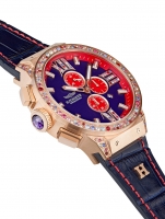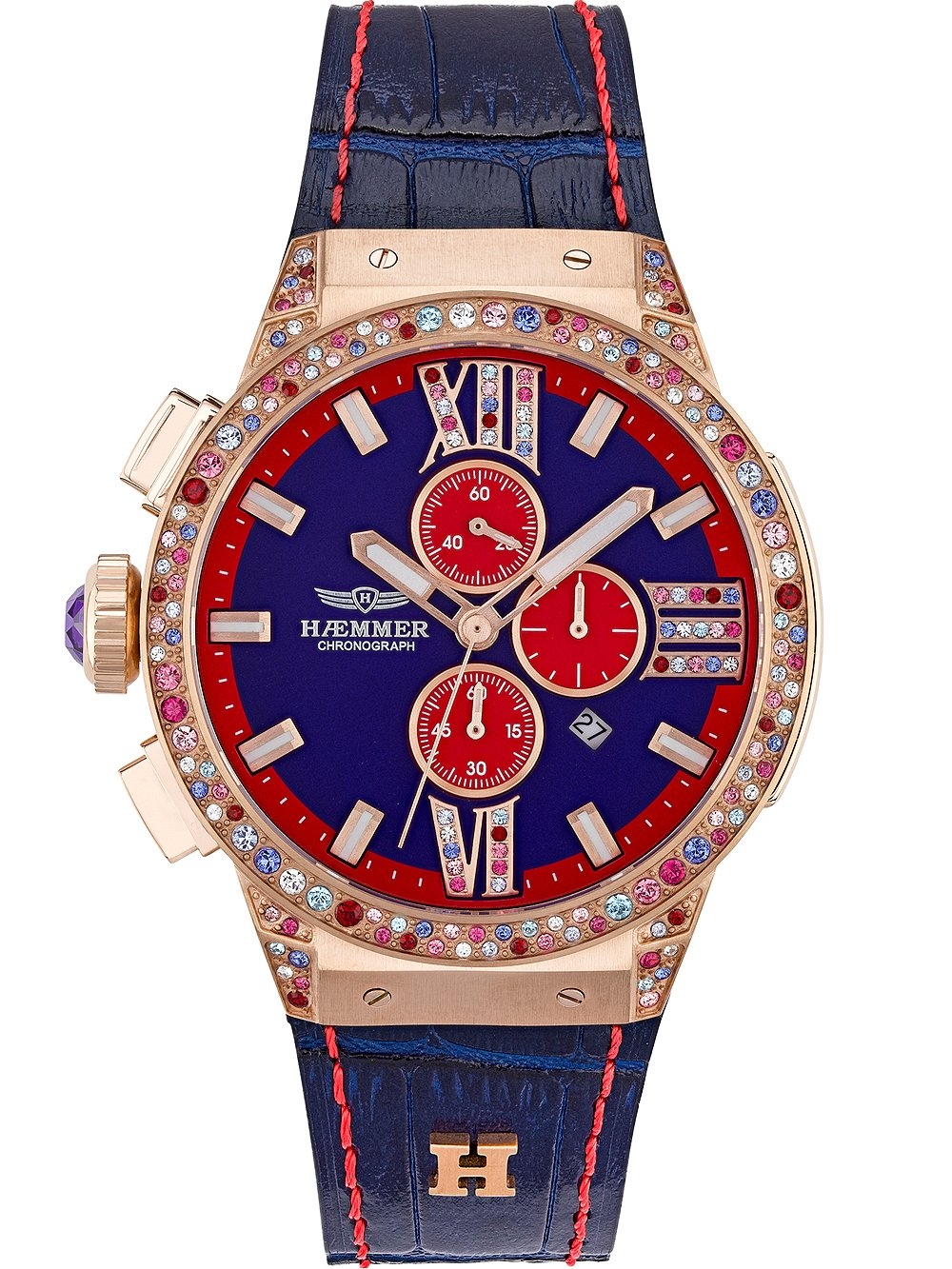 • Manufacturer no.: E-010 • Manufacturer series: Holly Chrono 45mm • Functions: Chronograph, Date, Hour, Minute, Second • Movement: Battery (quartz) • Movement label: 0S10, Miyota • Dial color: Blue • Display: Analog • Water resistant: 10 • Bezel: Fixed • Surface finish: Matted, Polished • Case color: Rosé gold • Case material: Stainless steel • Case thickness: 14 • Case shape: Round • Case trimming: Zirconia • Case width: 45 • Caseback: screwed, Stainless steel bottom • Gender: Ladies • Crown: Screwed • Glas: anti-reflecting, Saphire glass • Lighting: Illumin. hands, Illumin. indexes, trigalight® , Tritium-Illuminant • Style: Fashion • Strap material: Calf leather • Strap color: Blue • Lug width: 27 • Clasp: Buckle clasp • Max wrist circumferences: 200 • Item weight: 0.13 • Scope of delivery: Box, Instruction, Packaging, Warranty documents
