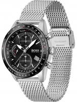 Brand: Hugo Boss • Manufacturer no.: 1513886 • Manufacturer series: Pilot Edition Chrono 44mm • Functions: 24-hours, Chronograph, Date, Hour, Minute, Second • Movement: Battery (quartz) • Dial color: Black • Display: Analog • Water resistant: 5 • Bezel: bidirectional, Turnable • Surface finish: Matted, Polished • Case color: Silver • Case material: Stainless steel • Case thickness: 13 • Case shape: Round • Case width: 44 • Caseback: screwed, Stainless steel bottom • Gender: Mens • Glas: hardened, Mineral glass • Lighting: Illumin. hands, Illumin. indexes • Style: Sporty • Strap material: Stainless steel • Strap color: Silver • Lug width: 22 • Clasp: Clip clasp • Max wrist circumferences: 215 • Item weight: 0.13 • Scope of delivery: Box, Instruction, Packaging, Warranty documents"