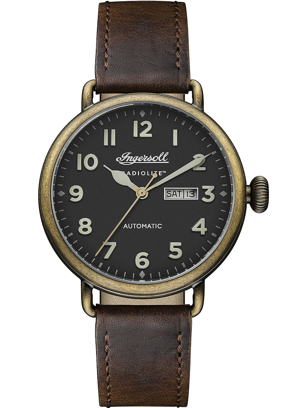 Brand: Ingersoll • Manufacturer no.: I03403 • Manufacturer series: The Trenton automatic 44mm I03403 • Functions: Date, Day, Hour, Minute, Second • Movement: Automatic • Dial color: Grey • Display: Analog • Water resistant: 5 • Bezel: Fixed • Surface finish: Matted • Case color: Gold • Case material: Stainless steel • Case thickness: 15 • Case shape: Round • Case width: 44 • Caseback: Glas bottom, screwed • Gender: Mens • Glas: hardened, Mineral glass • Lighting: Illumin. hands, Illumin. indexes • Style: Classic • Strap material: Calf leather • Strap color: Brown • Lug width: 20 • Clasp: Buckle clasp • Max wrist circumferences: 230 • Item weight: 0.09 • Scope of delivery: Box, Instruction, Packaging, Warranty documents"