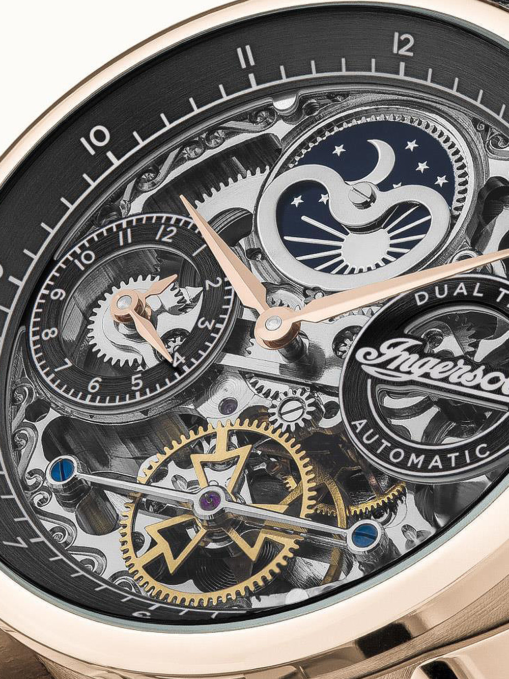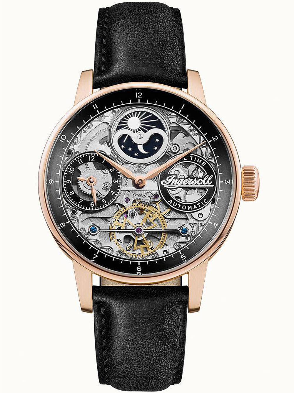 Brand: Ingersoll • Manufacturer no.: I07705 • Manufacturer series: The Jazz dual-time automatic 42mm I07705 • Functions: 2nd timezone, Hour, Minute, Moon phase • Movement: Automatic • Dial color: Black, Silver • Display: Analog • Water resistant: 5 • Bezel: Fixed • Surface finish: Matted, Polished • Case color: Rosé gold • Case material: Stainless steel • Case thickness: 15 • Case shape: Round • Case width: 42 • Caseback: Glas bottom, screwed • Gender: Mens • Glas: hardened, Mineral glass • Style: Classic • Strap material: Calf leather • Strap color: Black • Lug width: 20 • Clasp: Buckle clasp • Max wrist circumferences: 230 • Item weight: 0.09 • Scope of delivery: Box, Instruction, Packaging, Warranty documents"