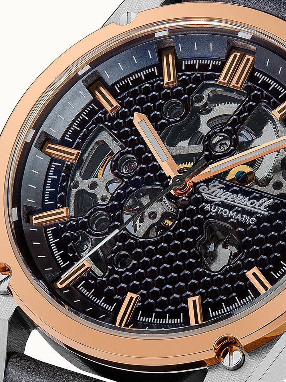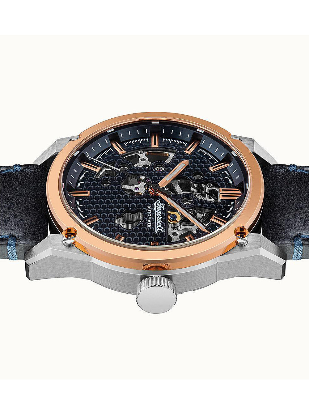 Brand: Ingersoll • Manufacturer no.: I11602 • Manufacturer series: The Carroll automatic 46mm I11602 • Functions: Hour, Minute, Second • Movement: Automatic • Dial color: Black • Display: Analog • Water resistant: 5 • Bezel: Fixed • Surface finish: Matted, Polished • Case color: Rosé gold, Silver • Case material: Stainless steel • Case thickness: 15 • Case shape: Round • Case width: 46 • Caseback: Glas bottom, screwed • Gender: Mens • Glas: hardened, Mineral glass • Lighting: Illumin. hands, Illumin. indexes • Style: Classic • Strap material: Calf leather • Strap color: Blue • Lug width: 24 • Clasp: Buckle clasp • Max wrist circumferences: 235 • Item weight: 0.10 • Scope of delivery: Box, Instruction, Packaging, Warranty documents"