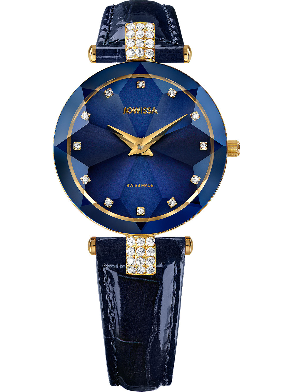 • Manufacturer no.: J5.617.M • Manufacturer series: Facet Strass 29mm • Functions: Hour, Minute • Movement: Battery (quartz) • Movement label: Swiss Made • Dial color: Blue • Display: Analog • Water resistant: 5 • Bezel: Fixed • Surface finish: Polished • Case color: Gold • Case material: Stainless steel • Case thickness: 9 • Case shape: Round • Case trimming: Zirconia • Case width: 29 • Caseback: pressed, Stainless steel bottom • Gender: Ladies • Glas: hardened, Mineral glass • Style: Elegant • Strap material: Calf leather • Strap color: Blue • Lug width: 15 • Clasp: Buckle clasp • Max wrist circumferences: 190 • Item weight: 0.02 • Scope of delivery: Box, Instruction, Packaging, Warranty documents