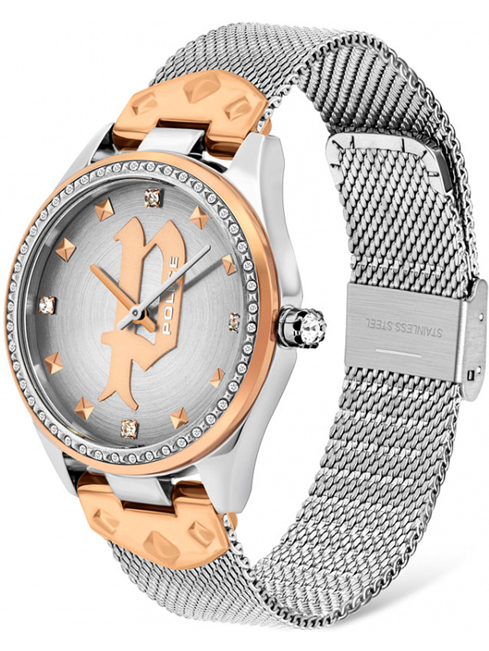 Brand: Police • Manufacturer no.: PL16029MSTR.13MM • Manufacturer series: Pongua 36mm • Functions: Hour, Minute • Movement: Battery (quartz) • Dial color: Silver • Display: Analog • Water resistant: 3 • Bezel: Fixed • Surface finish: Matted, Polished • Case color: Rosé gold, Silver • Case material: Stainless steel • Case thickness: 10 • Case trimming: Zirconia • Case width: 36 • Caseback: pressed, Stainless steel bottom • Gender: Ladies • Glas: hardened, Mineral glass • Style: Modern • Strap material: Stainless steel • Strap color: Silver • Lug width: 18 • Clasp: Clip clasp • Max wrist circumferences: 190 • Item weight: 0.07
