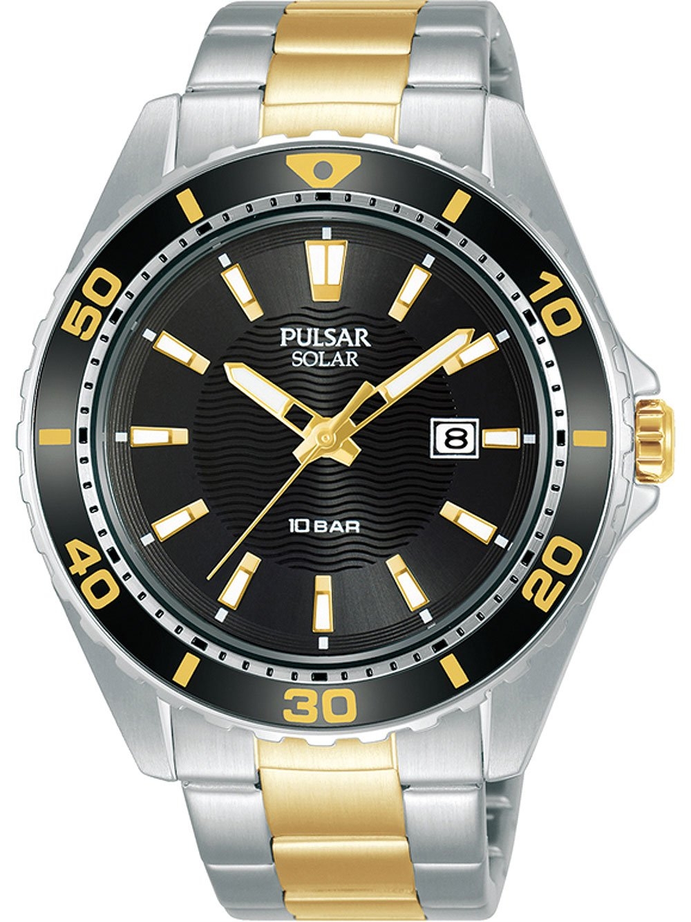 Brand: Pulsar • Manufacturer no.: PX3243X1 • Manufacturer series: Solar 44mm • Functions: Date, Hour, Minute, Second, Solar • Movement: Solar (quartz) • Dial color: Black • Display: Analog • Water resistant: 10 • Bezel: Fixed • Surface finish: Matted, Polished • Case color: Silver • Case material: Stainless steel • Case thickness: 11 • Case width: 44 • Caseback: pressed, Titanium bottom • Gender: Mens • Glas: hardened, Mineral glass • Lighting: Illumin. hands, Illumin. indexes • Style: Classic • Strap material: Stainless steel • Strap color: Gold, Silver • Lug width: 22 • Clasp: Folding clasp • Max wrist circumferences: 230 • Item weight: 0.15