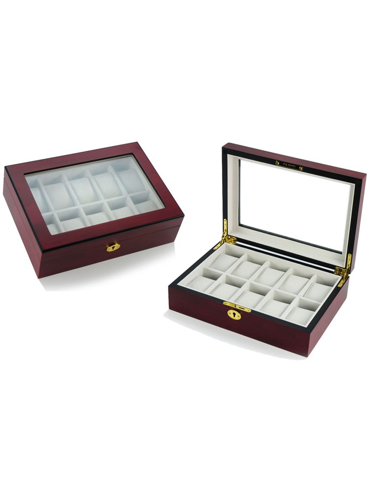 Exklusive, abschliessbare Uhrenschatulle mit Glasdeckel von Rothenschild aus Holz zur Aufbewahrung von bis zu 10 Uhren. Die einzelnen Faecher bieten ausreichend Platz fuer Uhren mit einem Durchmesser von bis zu ca. 53 mm. Uhren Accessoires von Rothenschild bieten eine exzellente Verarbeitungsqualität bei einem hervorragendem Preis-, Leistungsverhaeltnis.