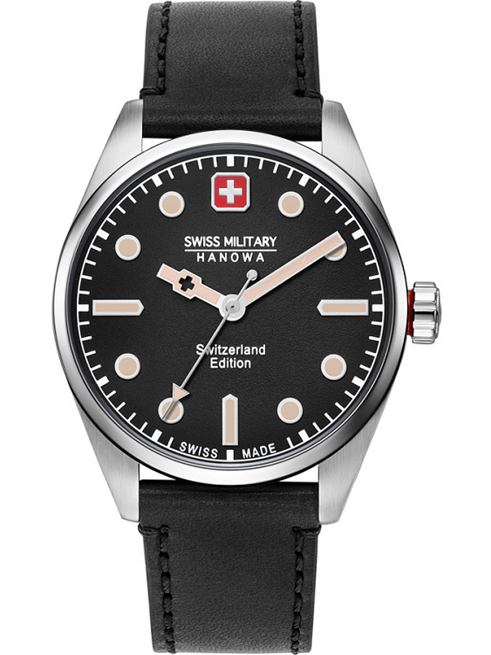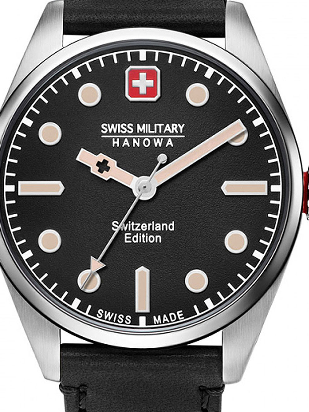 Brand: Swiss Military Hanowa • Manufacturer no.: 06-4345.04.007 • Manufacturer series: Mountaineer 42mm • Functions: Hour, Minute, Second • Movement: Battery (quartz) • Movement label: Ronda, 503 • Dial color: Black, Grey • Display: Analog • Water resistant: 10 • Bezel: Fixed • Surface finish: Matted, Polished • Case color: Silver • Case material: Stainless steel • Case thickness: 10 • Case width: 42 • Caseback: screwed, Stainless steel bottom • Gender: Mens • Glas: anti-reflecting, Saphire glass • Lighting: Illumin. hands, Illumin. indexes • Style: Sporty • Strap material: Calf leather • Strap color: Black • Lug width: 21 • Clasp: Buckle clasp • Max wrist circumferences: 210 • Item weight: 0.07
