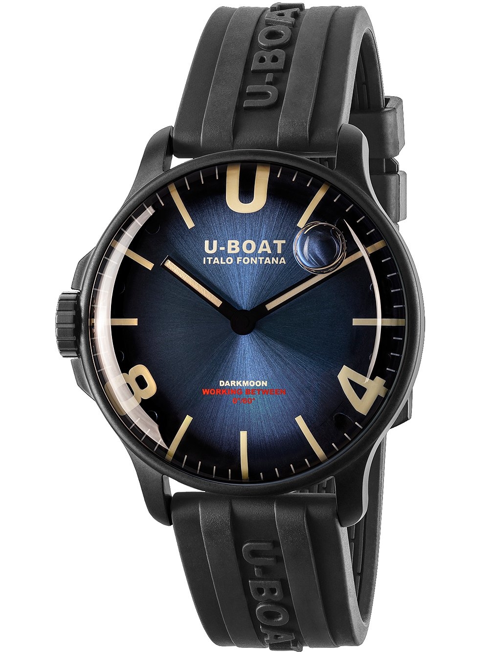 Brand: U-Boat • Manufacturer no.: 8700 • Manufacturer series: Darkmoon 44mm • Functions: Hour, Minute • Movement: Battery (quartz) • Movement label: Swiss Made • Dial color: Blue • Display: Analog • Water resistant: 5 • Bezel: Fixed • Surface finish: Matted • Case color: Black • Case material: Stainless steel • Case thickness: 18 • Case width: 44 • Caseback: screwed, Stainless steel bottom • Gender: Mens • Crown: Screwed • Glas: anti-reflecting, Saphire glass • Lighting: Illumin. hands, Illumin. indexes • Style: Modern • Strap material: Caoutchouc • Strap color: Black • Lug width: 22 • Clasp: Buckle clasp • Max wrist circumferences: 220 • Item weight: 0.12