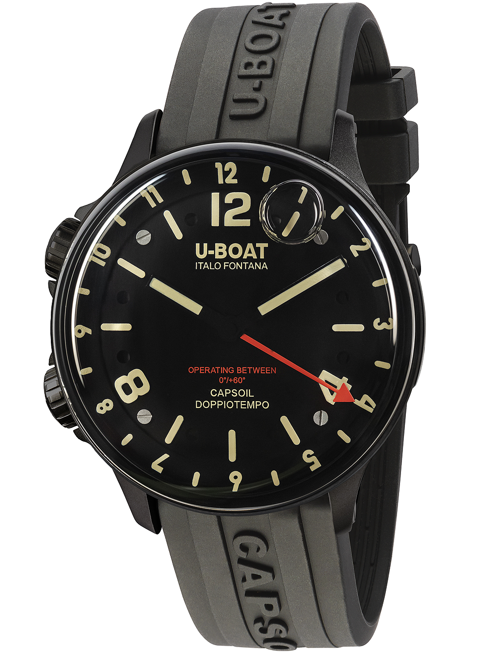 • Manufacturer no.: 8770 • Manufacturer series: Capsoil Qs. Doppiotempo DLC GMT 45mm 8770 • Functions: 2nd timezone, GMT, Hour, Minute • Movement: Battery (quartz) • Movement label: Swiss Made • Dial color: Black • Display: Analog • Water resistant: 10 • Bezel: Fixed • Surface finish: Matted • Case color: Black • Case material: Stainless steel • Case thickness: 20 • Case width: 45 • Caseback: screwed, Stainless steel bottom • Gender: Mens • Crown: Screwed • Glas: anti-reflecting, Saphire glass • Lighting: Illumin. hands, Illumin. indexes • Style: Modern • Strap material: Caoutchouc • Strap color: Black • Lug width: 22 • Clasp: Buckle clasp • Max wrist circumferences: 220 • Item weight: 0.14 • Scope of delivery: Box, Instruction, Packaging, Warranty documents