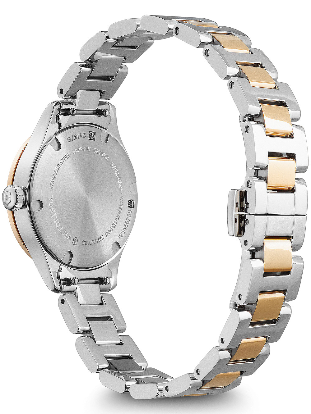 Brand: Victorinox • Manufacturer no.: 241876 • Manufacturer series: Alliance XS 28mm • Functions: Hour, Minute, Second • Movement: Battery (quartz) • Dial color: Black • Display: Analog • Water resistant: 10 • Bezel: Fixed • Surface finish: Polished • Case color: Rosé gold, Silver • Case material: Stainless steel • Case thickness: 8 • Case trimming: Swarovski • Case width: 28 • Caseback: screwed, Stainless steel bottom • Gender: Ladies • Glas: anti-reflecting, Saphire glass • Lighting: Illumin. hands, Illumin. indexes • Style: Modern • Strap material: Stainless steel • Strap color: Rosé gold, Silver • Lug width: 12 • Clasp: Butterfly clasp • Max wrist circumferences: 180 • Item weight: 0.07